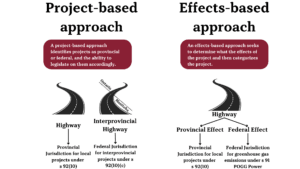 As the appealing party, the federal government focused on critiquing the ABCA decision and asserting that the IAA is constitutional. In their factum, they claimed that the ABCA improperly took a project-based approach as opposed to an effects-based approach to understanding the IAA.[14] The idea of project-based and effects-based approaches is clarified in the diagram below.