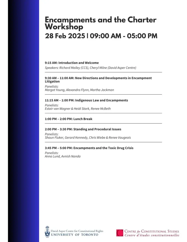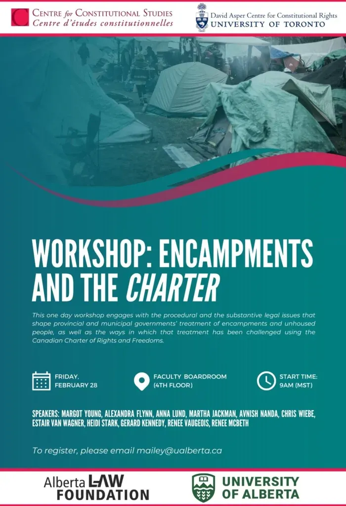 On February 28, 2025, the Centre for Constitutional Studies (University of Alberta) and the David Asper Centre for Constitutional Rights (University of Toronto) co-hosted a workshop at the University of Alberta on the role of the Charter in challenging the displacement of unhoused persons living in encampments. The workshop was one half of a larger collaboration between CCS and Asper on the legal and constitutional issues surrounding decampment, whether a disrupted encampment serves as a necessary means of shelter (the focus of this workshop) or political expression and protest (the focus of second workshop, planned for November 13, 2025). You can view the full workshop program below.