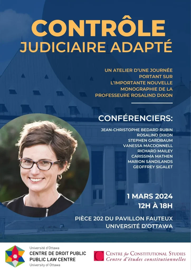 This workshop took place on March 1, 2024 at the University of Ottawa and was co-organized by the University of Ottawa Public Law Centre and the Centre for Constitutional Studies (University of Alberta). The workshop brought together a small group of constitutional experts to discuss Rosalind Dixon's landmark monograph, Responsive Judicial Review (RJR). In particular, the workshop aimed to bring the representation-reinforcing theory articulated in RJR to bear on current constitutional issues facing Canadians, including how courts should respond to the uptick in provincial recourse to the notwithstanding clause, the proper role of unwritten constitutional principles in judicial decision-making, and the limits that principles like democracy and federalism place on the practice of judicial review.