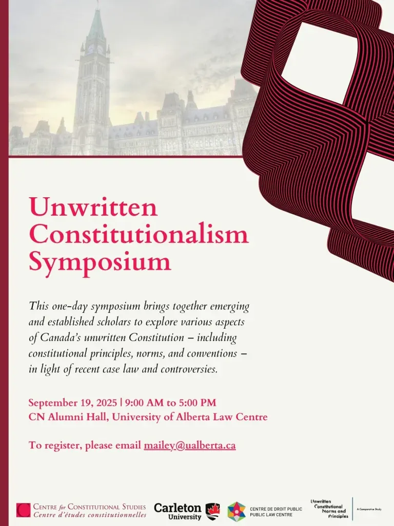 On September 19, 2025 the Centre for Constitutional Studies hosted a symposium at the University of Alberta in collaboration with the University of Ottawa Public Law Centre, the Barton Chair at Carleton University, and the Unwritten Constitutional Norms and Principles Project. The symposium was funded through a special project grant from the Alberta Law Foundation and brought together scholars to discuss the role that unwritten constitutionalism plays and ought to play in political and legal decision-making, as well as the place of specific unwritten principles -- whether legally recognized or not -- in the Canadian constitutional order.