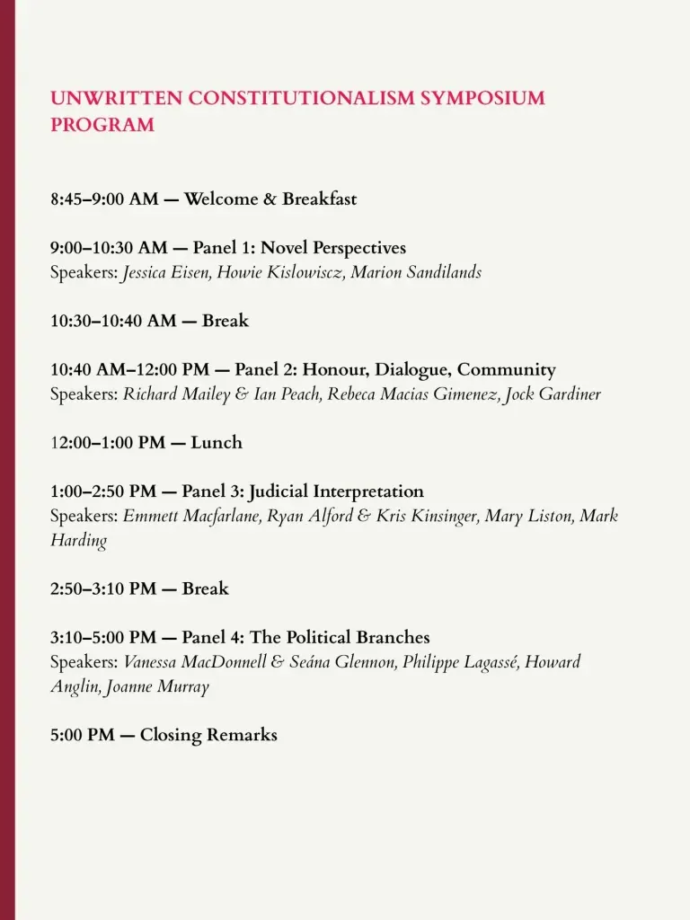 A selection of symposium papers will be published as special issues of the Review of Constitutional Studies and the Constitutional Forum, likely in late 2026. To learn more about the focus of symposium papers, see the event program: https://www.constitutionalstudies.ca/wp-content/uploads/2025/10/Unwritten-Constitutionalism-Program.pdf