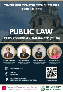 Please join us for the launch of Public Law: Cases, Commentary, and Analysis (5th Edition), with authors Professor Gerard Kennedy (University of Alberta, Faculty of Law), Professor Emeritus Philip Bryden (University of Alberta, Faculty of Law), Malcolm Lavoie (Government of Alberta, Ministry of Justice), and Professor Frankie Young (University of Ottawa, Faculty of Law).