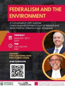 Join us for a fireside chat with Justice Grant Huscroft of the Court of Appeal for Ontario and Justice Kevin Feehan of the Court of Appeal for Alberta. This conversation will be moderated by Professor Malcolm Lavoie (U of A Faculty of Law) and will focus on the federal government's powers to regulate the environment in Canada, especially in light of high profile Supreme Court judgments on the extent of federal jurisdiction over carbon pricing and environmental impact assessments.